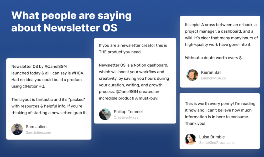 "Newsletter OS launched today & all I can say is WHOA. Had no idea you could build a product using @NotionHQ. The layout is fantastic and it's *packed* with resources & helpful info. If you're thinking of starting a newsletter, grab it!" - Sam J. (SamJulien.com)
